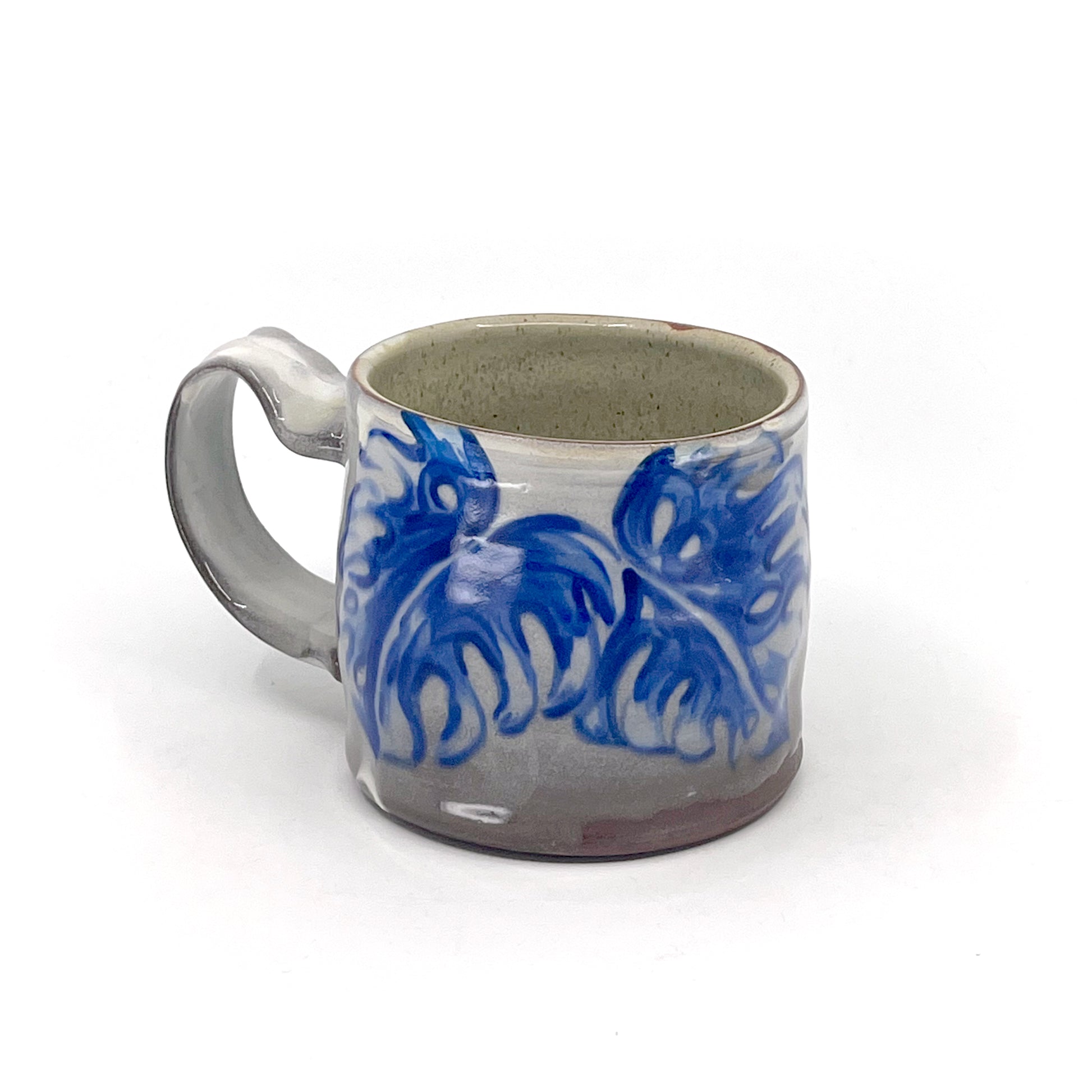 Handmade ceramic mug, electric fired to cone 6 with underglaze painting of blue monstera leaves.